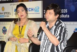 Rituparna Sengupta, Actress & Film Producer addressing the gathering. On her (R) Shiboprosad Mukherjee, Film Director, Writer & Actor and Jinia Sen, Screenplay Writer.