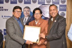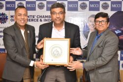 Deepak Jalan, Past President and Sanjib Sanghi, Co-Chairman, Council on IT & Communication, MCCI presenting a memento to S. Krishnan, IAS, Secretary, Ministry of Electronics & Information Technology, Government of India