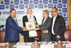 Arun Kumar Garodia, Chairman, Council on Foreign Trade, MCCI presenting a memento to Tomaz Mencin, Ambassador of Slovenia in India (L) Sheo Shankar Bagaria, Honorary Consul of Slovenia in Kolkata & Past President, MCCI and (R) Mahesh Chandra Keyal, Committee Member, MCCI